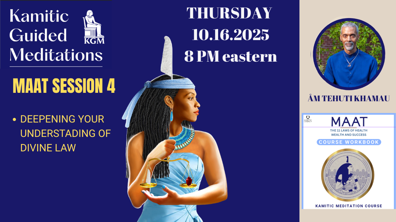 Join Åm Tehuti Khamau for Session 4 of the MAAT CYCLE KAMITIC GUIDED MEDITATION. Learn how to use the MAAT 11 LAWS COURSE AND BOOK to enhance your Maat meditation experience.