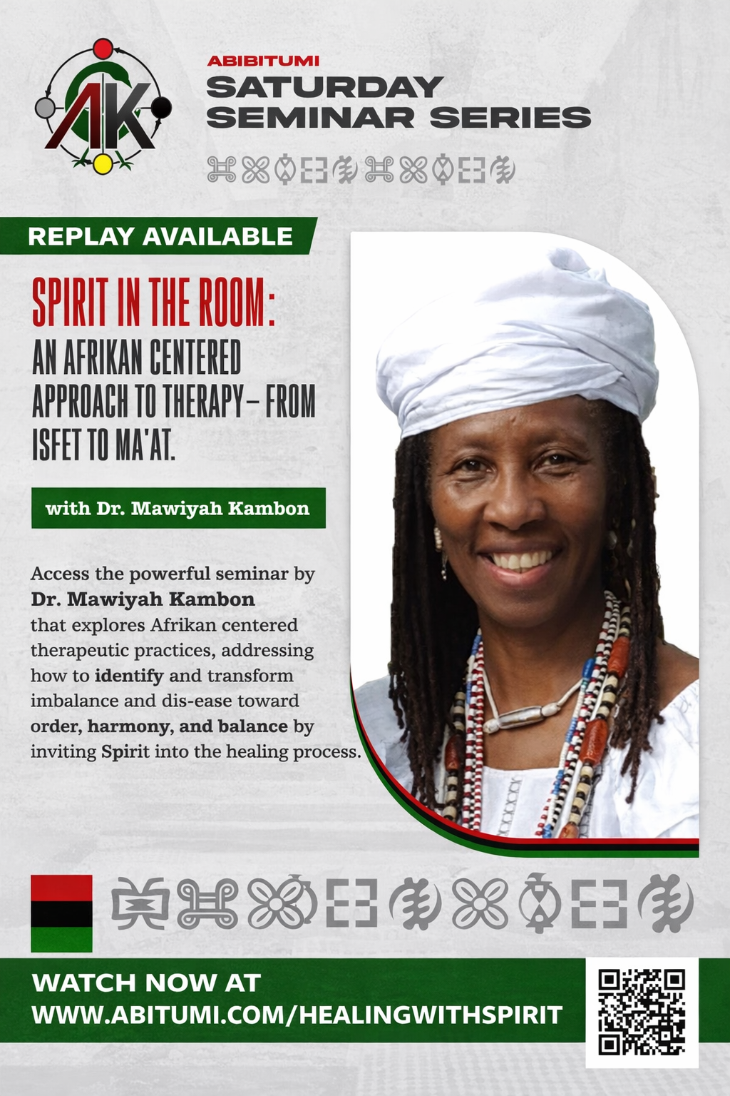 Watch the replay of this powerful Abibitumi Saturday Seminar Series session with Dr. Mawiyah Kambon: Spirit in the Room: An Afrikan-Centered Approach to Therapy — From Isfet to Ma’at.