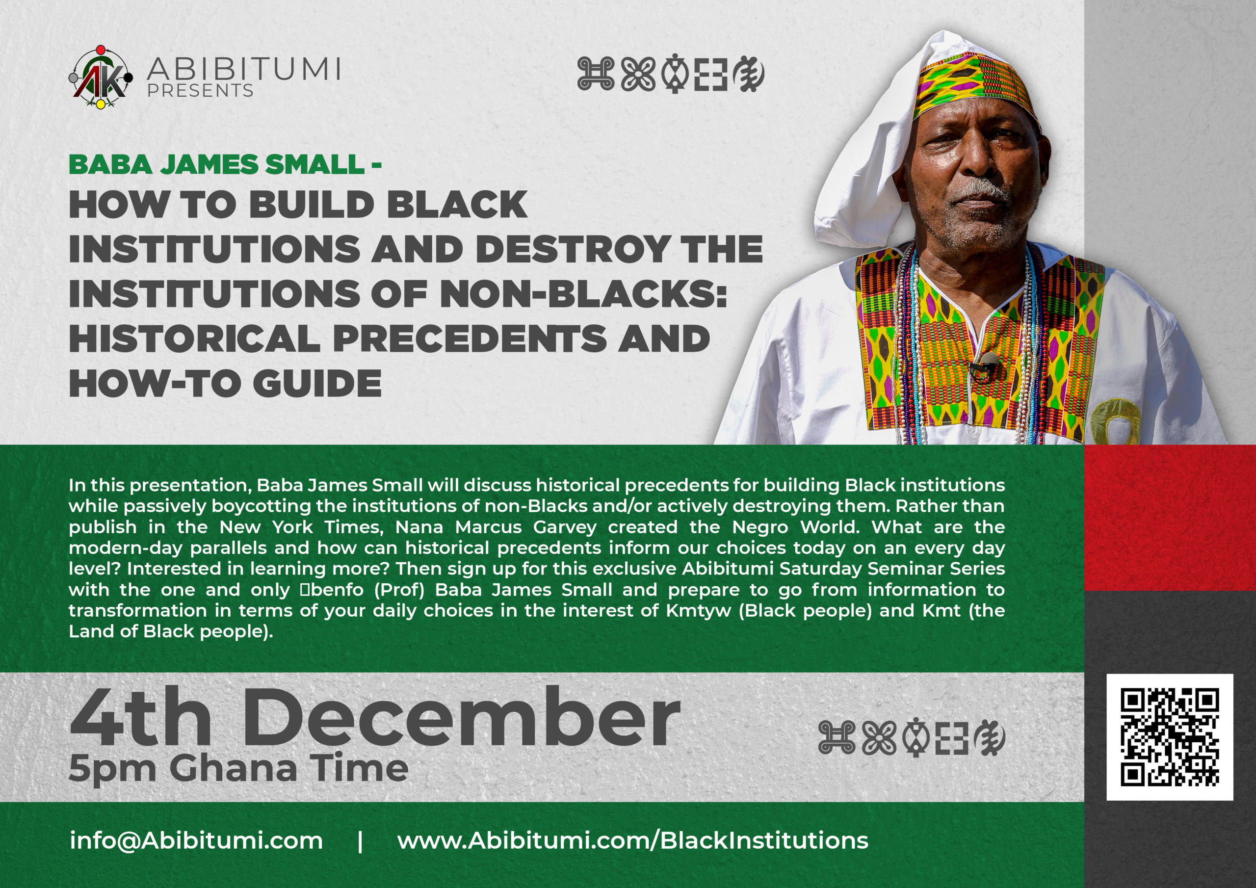 Abstract: In this presentation, Baba James Small will discuss historical precedents for building Black institutions while passively boycotting the institutions of non-Blacks and/or actively destroying them. Rather than publish in the New York Times, Nana Marcus Garvey created the Negro World. What are the modern-day parallels and how can historical precedents inform our choices today on an every day level? Interested in learning more? Then sign up for this exclusive Abibitumi Saturday Seminar Series with the one and only Ɔbenfo (Prof) Baba James Small and prepare to go from information to transformation in terms of your daily choices in the interest of Kmtyw (Black people) and Kmt (the Land of Black people).