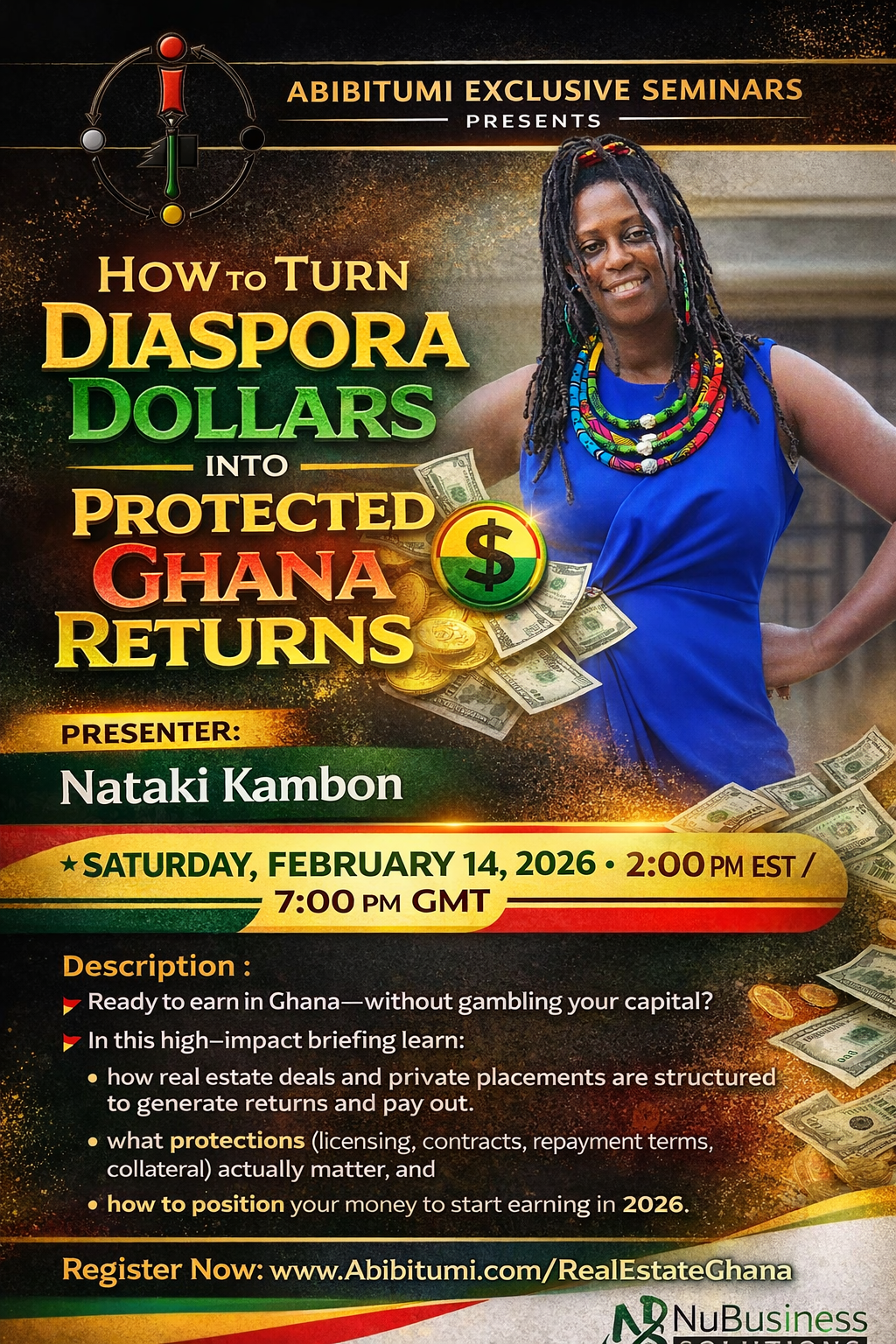 Ready to earn in Ghana—without gambling your capital? In this high-impact briefing, you’ll see exactly *how real estate deals and private placements are structured to generate returns and pay out*, what *protections* (licensing, contracts, repayment terms, collateral) actually matter, and *how to position your money to start earning in 2026*. With, Nataki Kambon, Ghana’s *first Diasporan-licensed real estate broker* now in play, the D.O.O.R. is open for the Historic Diaspora to invest *smarter, safer, and sooner*.
