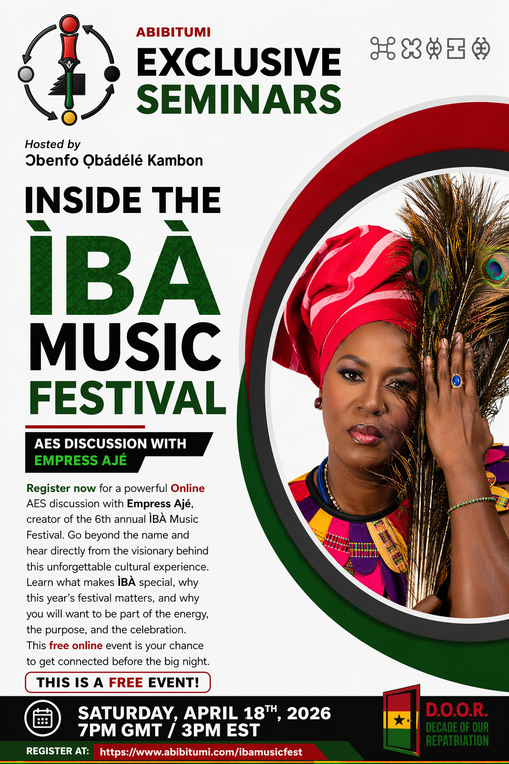 Register now for a powerful online AES discussion with Empress Ajé, creator of the 6th annual ÌBÀ Music Festival. Go beyond the name and hear directly from the visionary behind this unforgettable cultural experience. Learn what makes the ÌBÀ Music Festival special, why this year’s festival matters, and why you will want to be part of the energy, the purpose, and the celebration. This free online event is your chance to get connected before the big night.