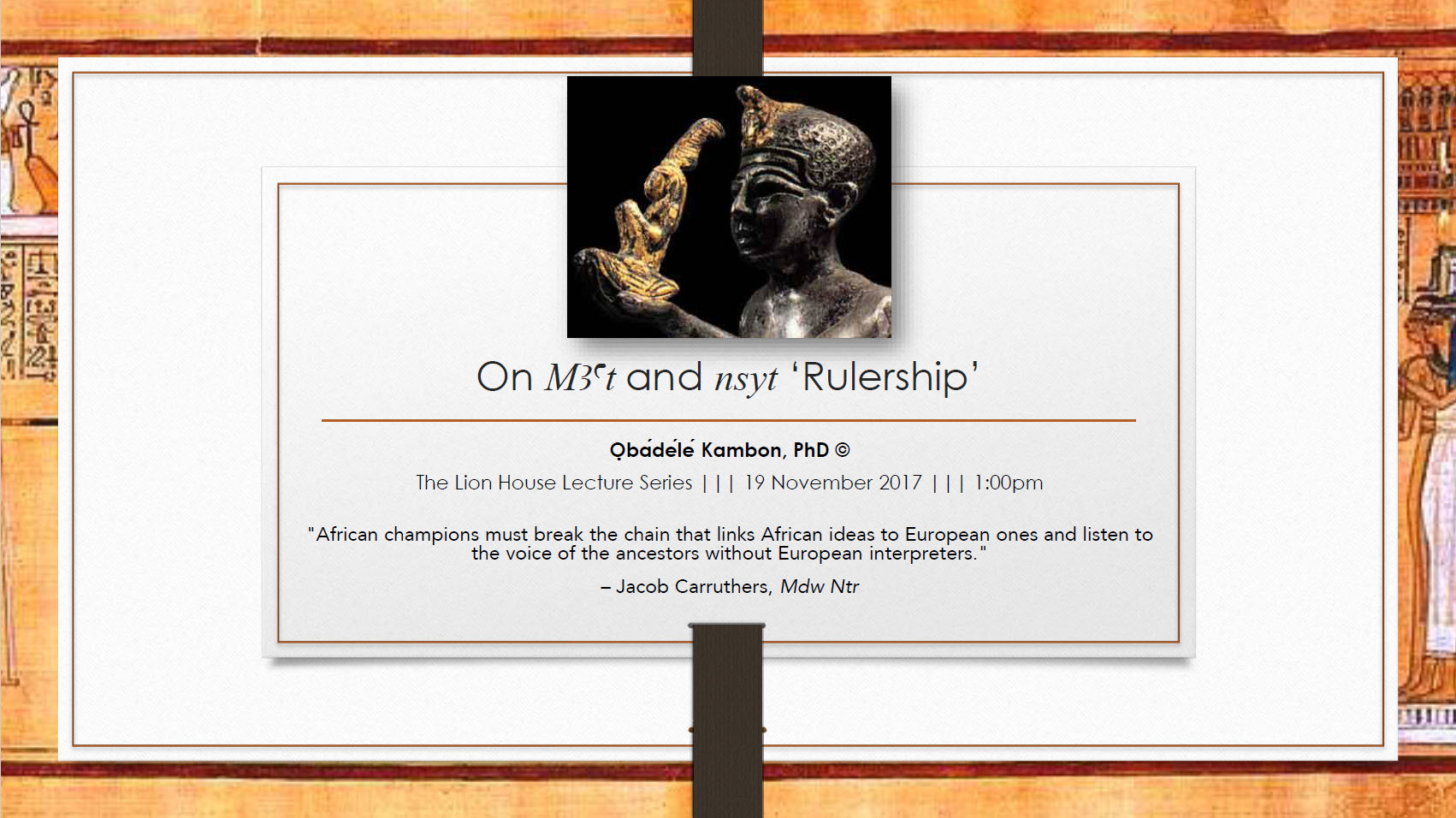 Okunini Ọbádélé Kambon delivered a penetrating lecture on the relationship between Ma’at—truth, justice, righteousness, harmony, balance, reciprocity, and order—and Nsyt (Rulership) in Ancient Kmt. Drawing from dozens of primary texts, he provides a precise, text-based analysis of how the Kmtyw ‘Black people’ understood rulership as a sacred duty to maintain cosmic and social order.