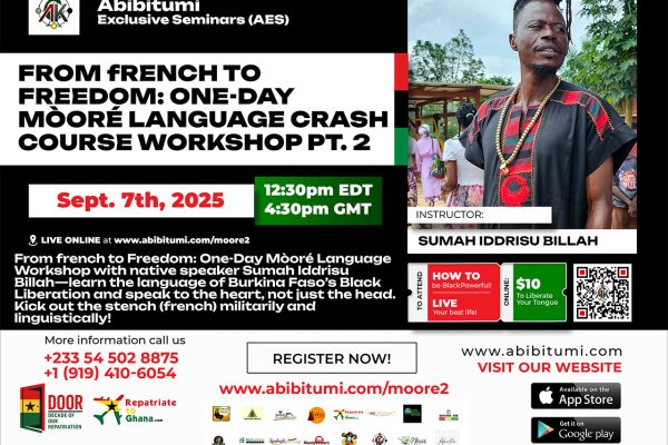 Video Replay: From French to Freedom: One-Day Mòoré Language Workshop with native speaker Sumah Iddrisu Billah—learn the language of Burkina Faso’s Black Liberation and speak to the heart, not just the head.