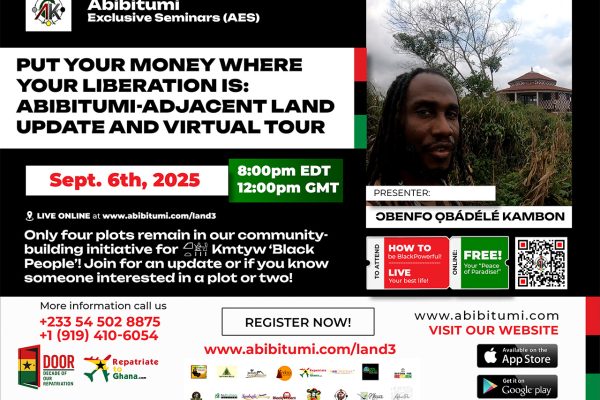 Prime land opportunity next to Abibitumi Headquarters in Ghana — secure your 100×70 plot for $10,000 and invest in building a strong, liberated Black community.